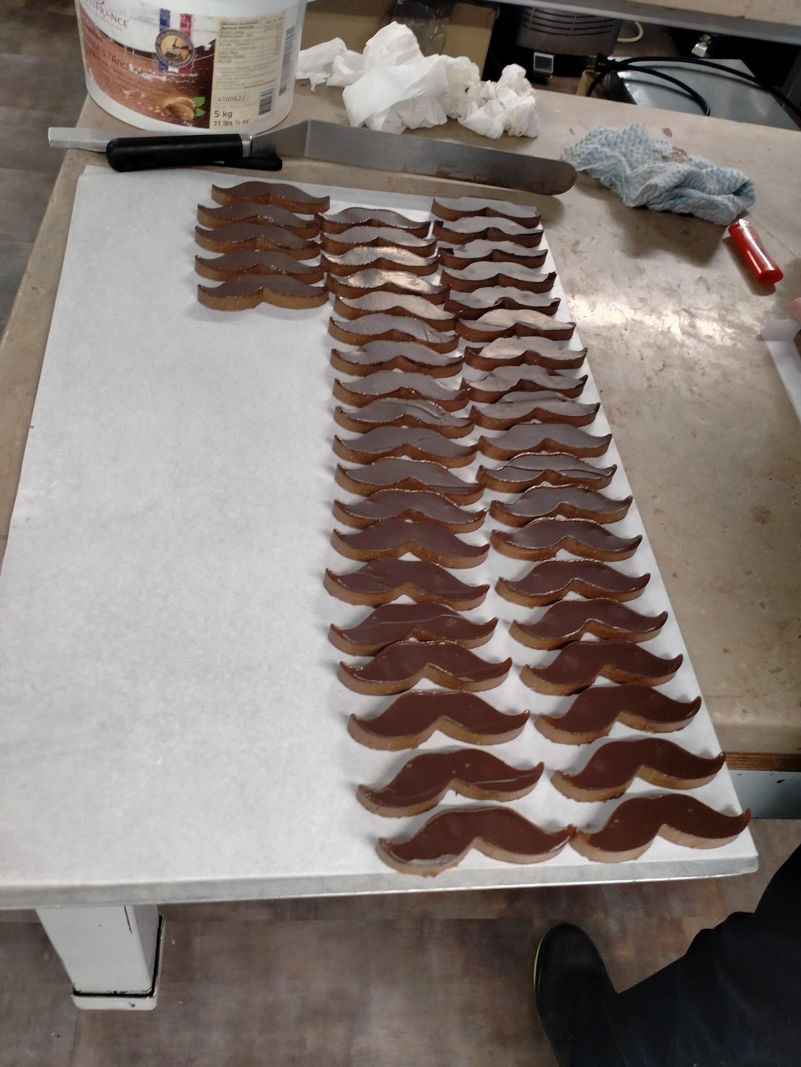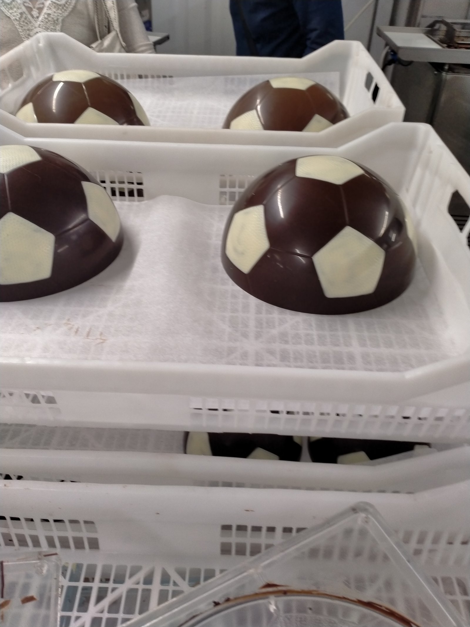 bonbons carrés passent à l'enrobeuse mais les pièces rondes sont trempées une par une à la main ce