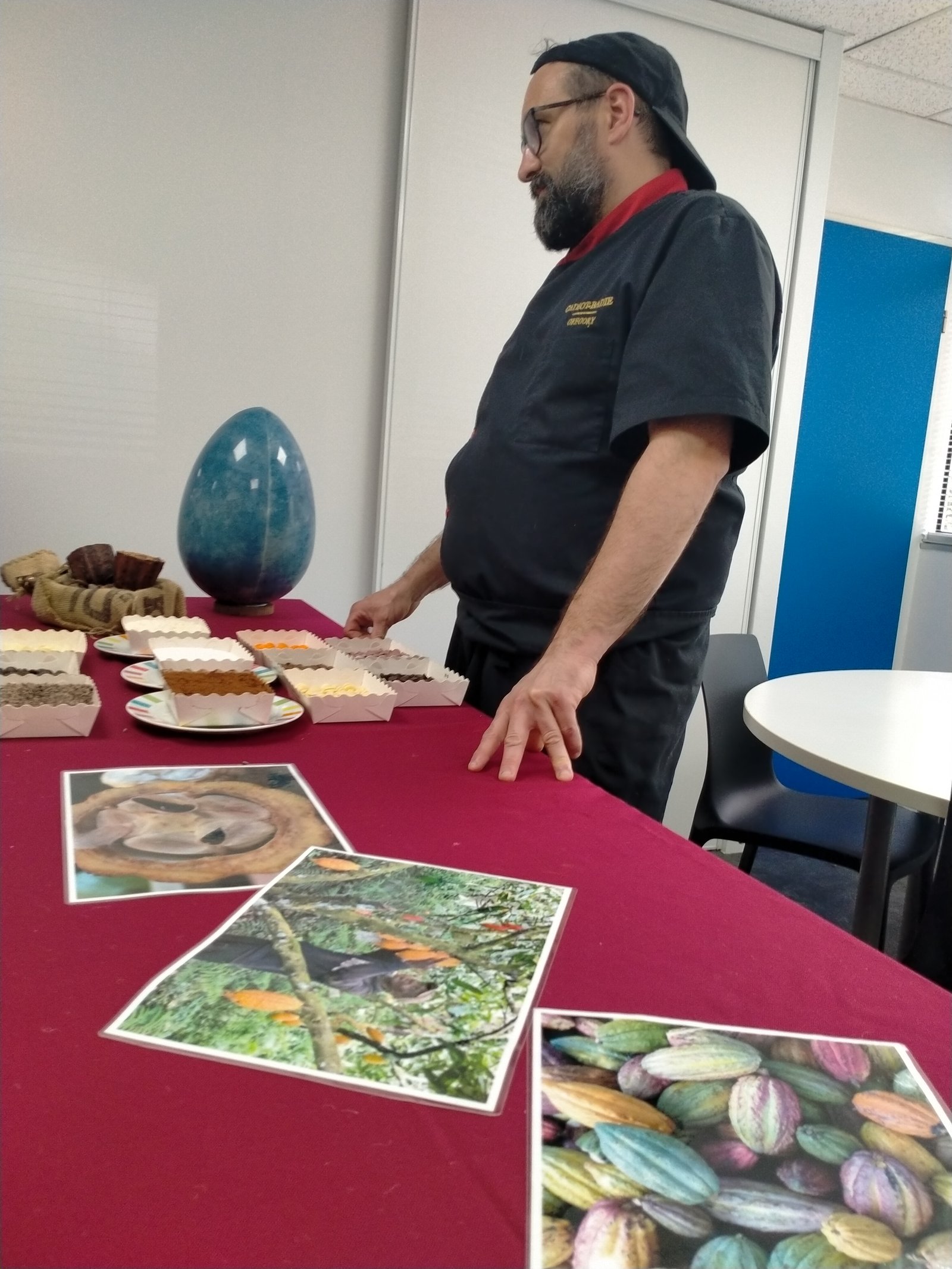 C'est Grégory , le chocolatier, notre accompagnateur . Patiemment il va nous montrer le parcours du
